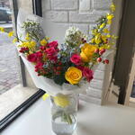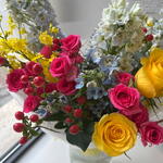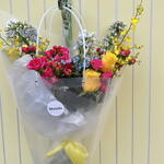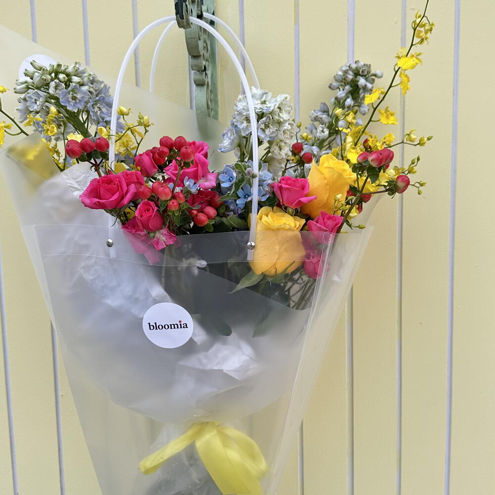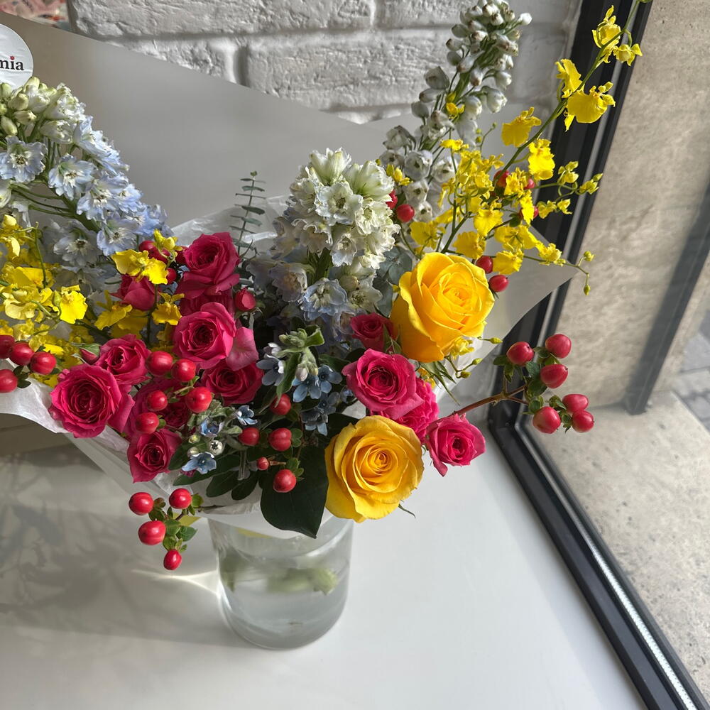 Гиперикум - 2 шт. Дельфиниум - 3 шт. Роза - 2 шт. Оксипеталум - 2 шт. Эвкалипт Цинерея - 4 шт. Спрей роза - 3 шт. переноска для цветов - 1 шт. онцидиум - 2 шт.