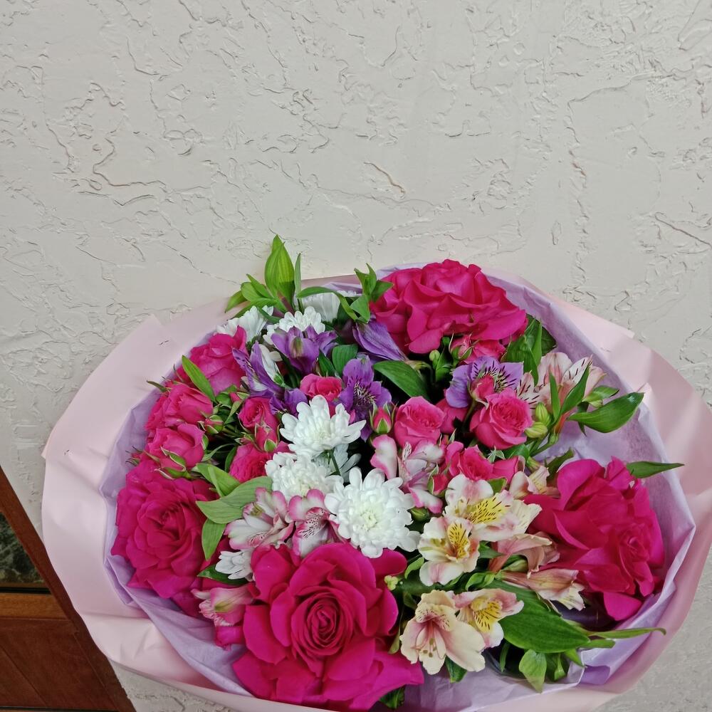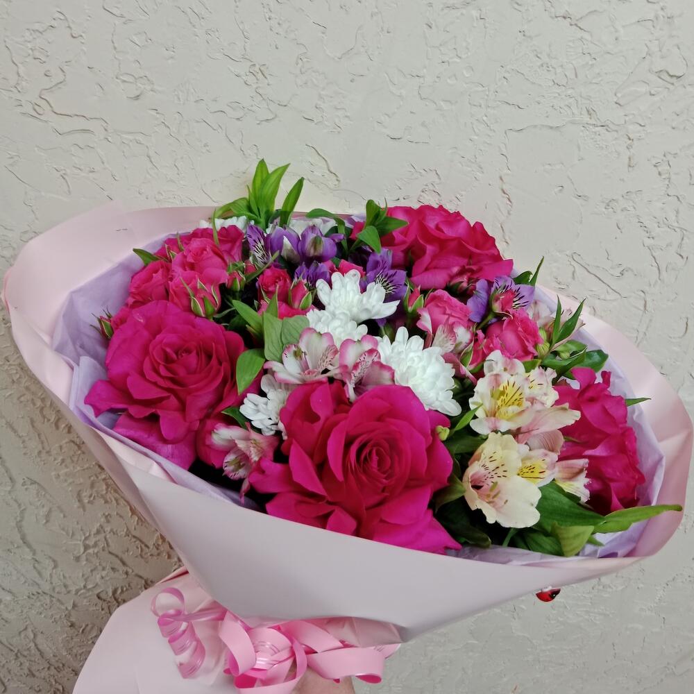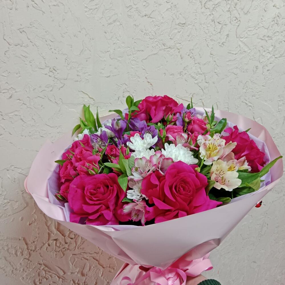 Роза кустовая - 2 шт. Хризантема кустовая - 2 шт. Роза французская розовая - 5 шт. альстромериямикс европа - 7 шт.