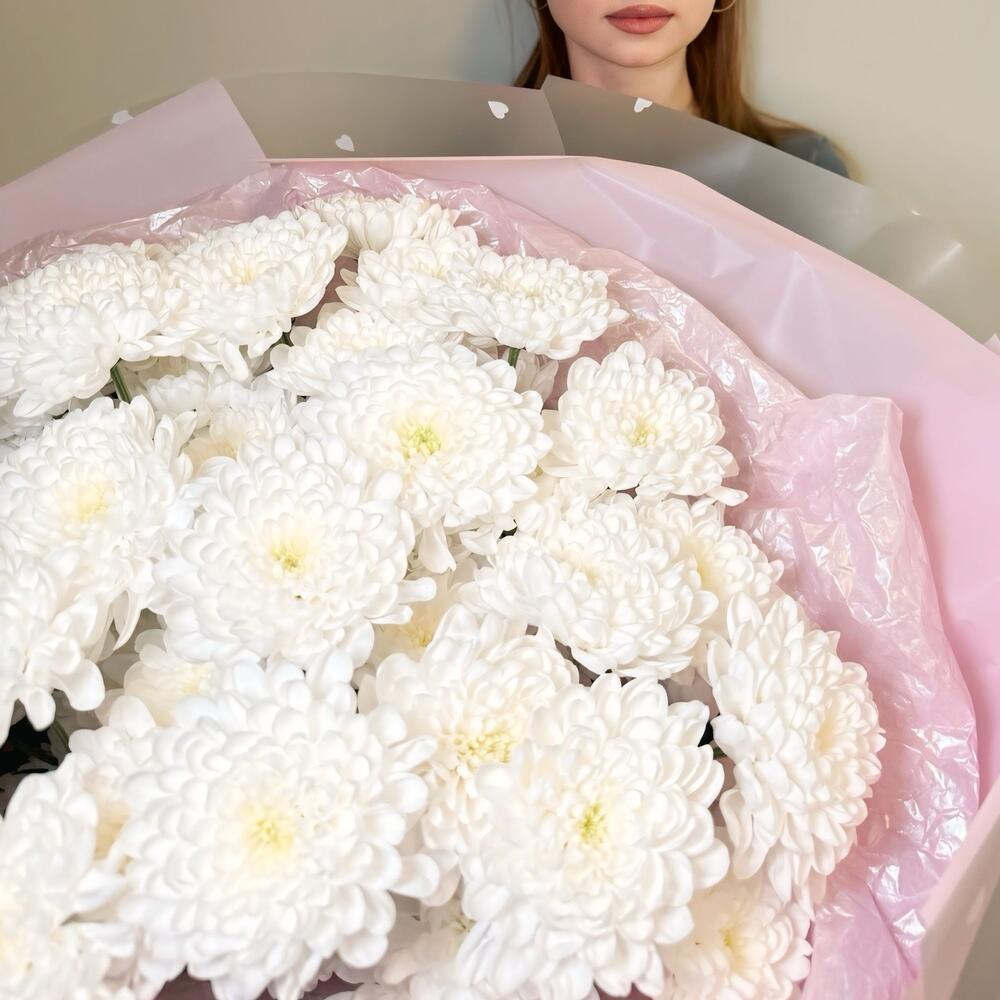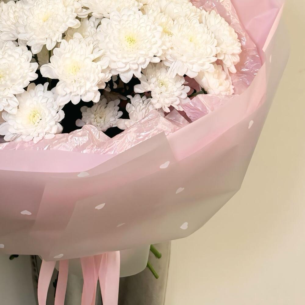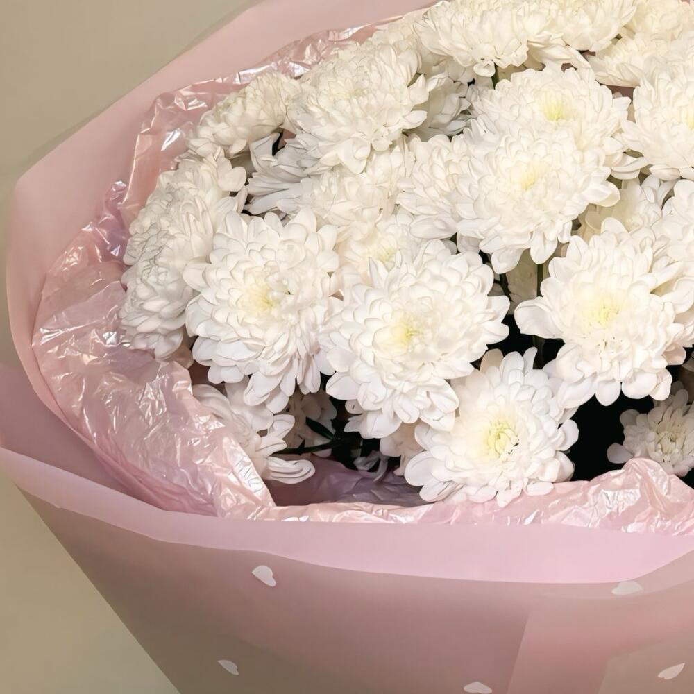 Этот изысканный букет из белоснежных хризантем — символ чистоты, искренности и тепла. Нежные пушистые лепестки создают ощущение легкости и свежести, а их элегантный вид делает композицию универсальным подарком для любого случая. Такой букет станет прекрасным знаком внимания, выражая самые добрые пожелания и светлые чувства.🤍