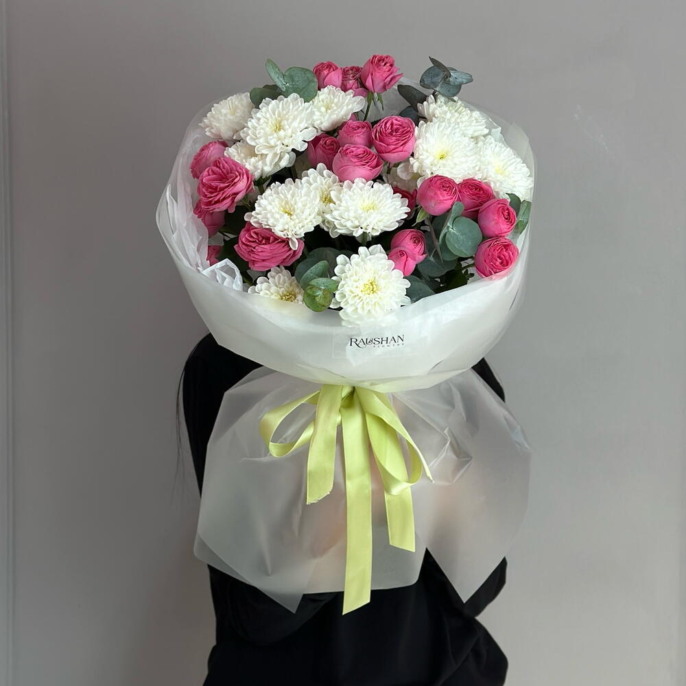 Роза кустовая - 4 шт. Хризантема кустовая - 3 шт. Эвкалипт Микс - 2 шт.