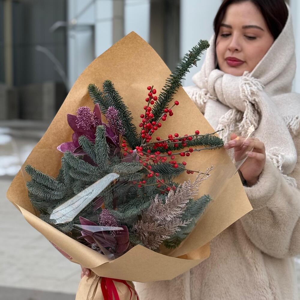 Зимний банч из ароматной хвои, ягод илекса и сухоцветов