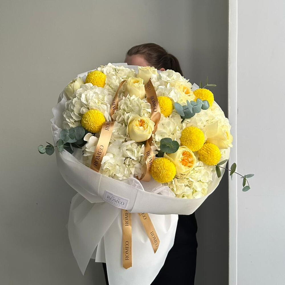 Гортензия - 7 шт. Лента - 1 шт. Эвкалипт - 1 шт. Пионовидная роза - 7 шт. Хризантема одноголовая - 7 шт. Оформление - 1 шт.