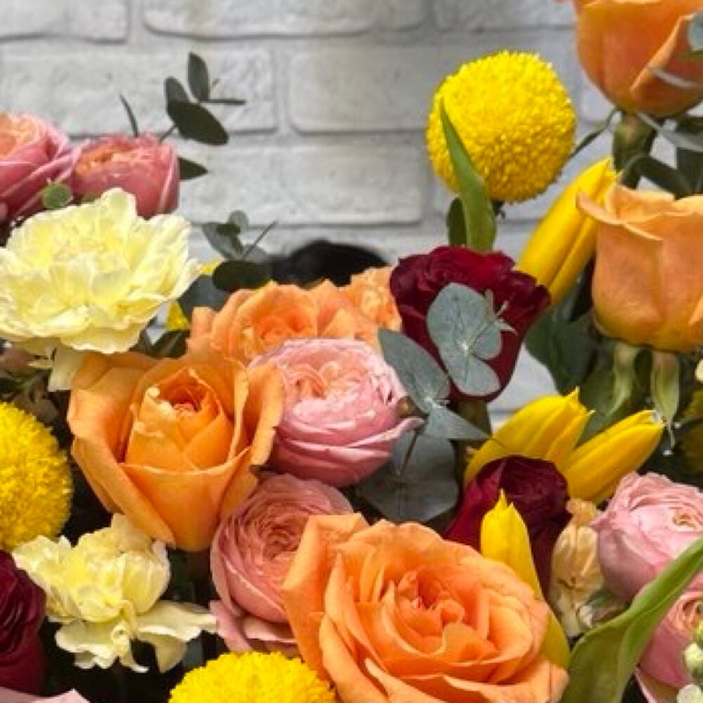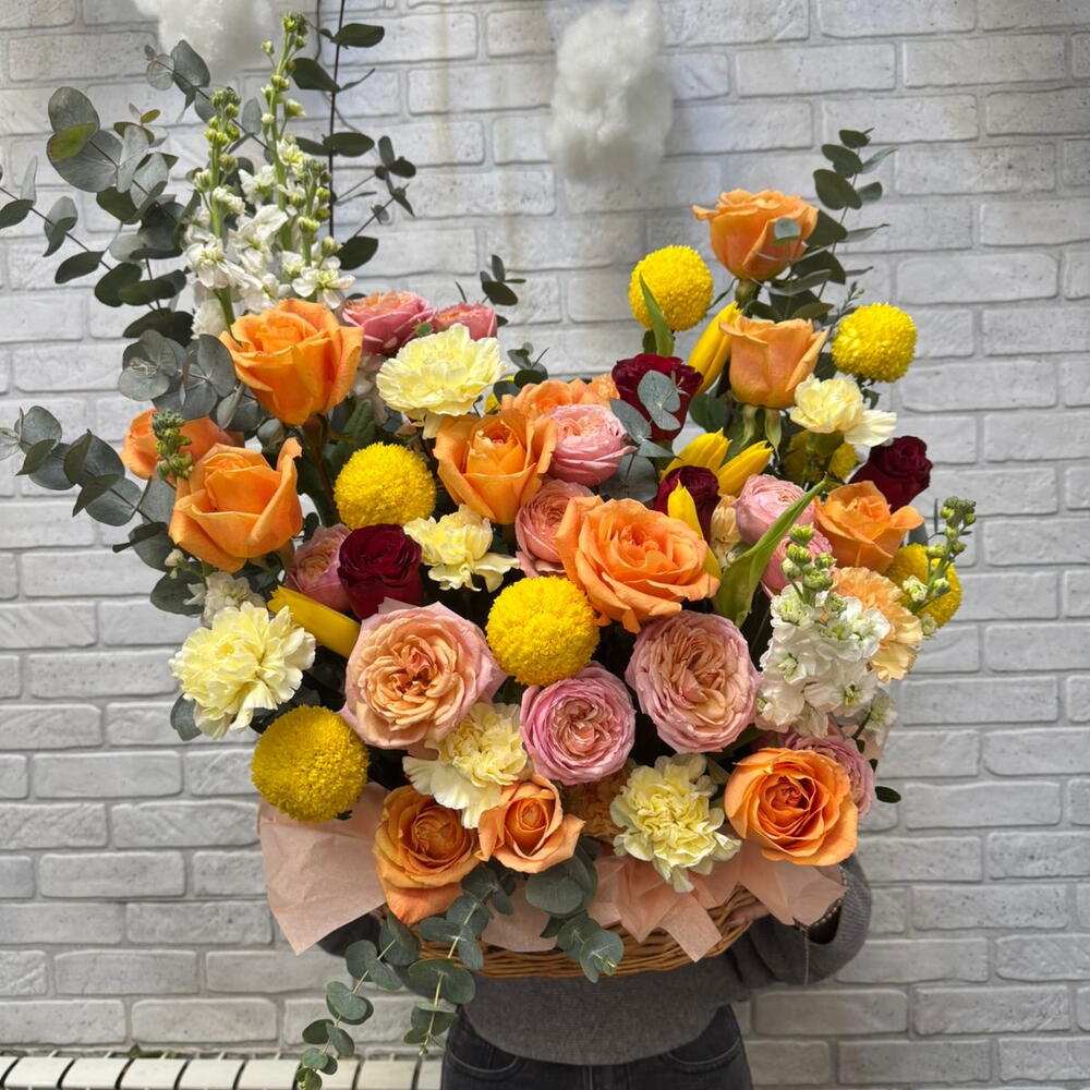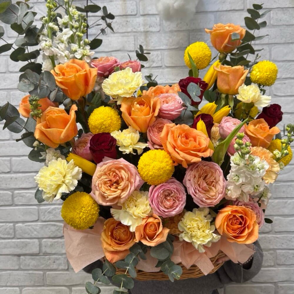 Лента - 1 шт. Маттиола - 5 шт. Тюльпан - 5 шт. Тишью - 4 шт. Оазис - 2 шт. Корзина плетеная - 1 шт. Эвкалипт Цинерея - 5 шт. джульетта роза пионовидная кустовая - 3 шт. розы - 15 шт. момоко хризантема - 5 шт. желтый диантус - 7 шт.