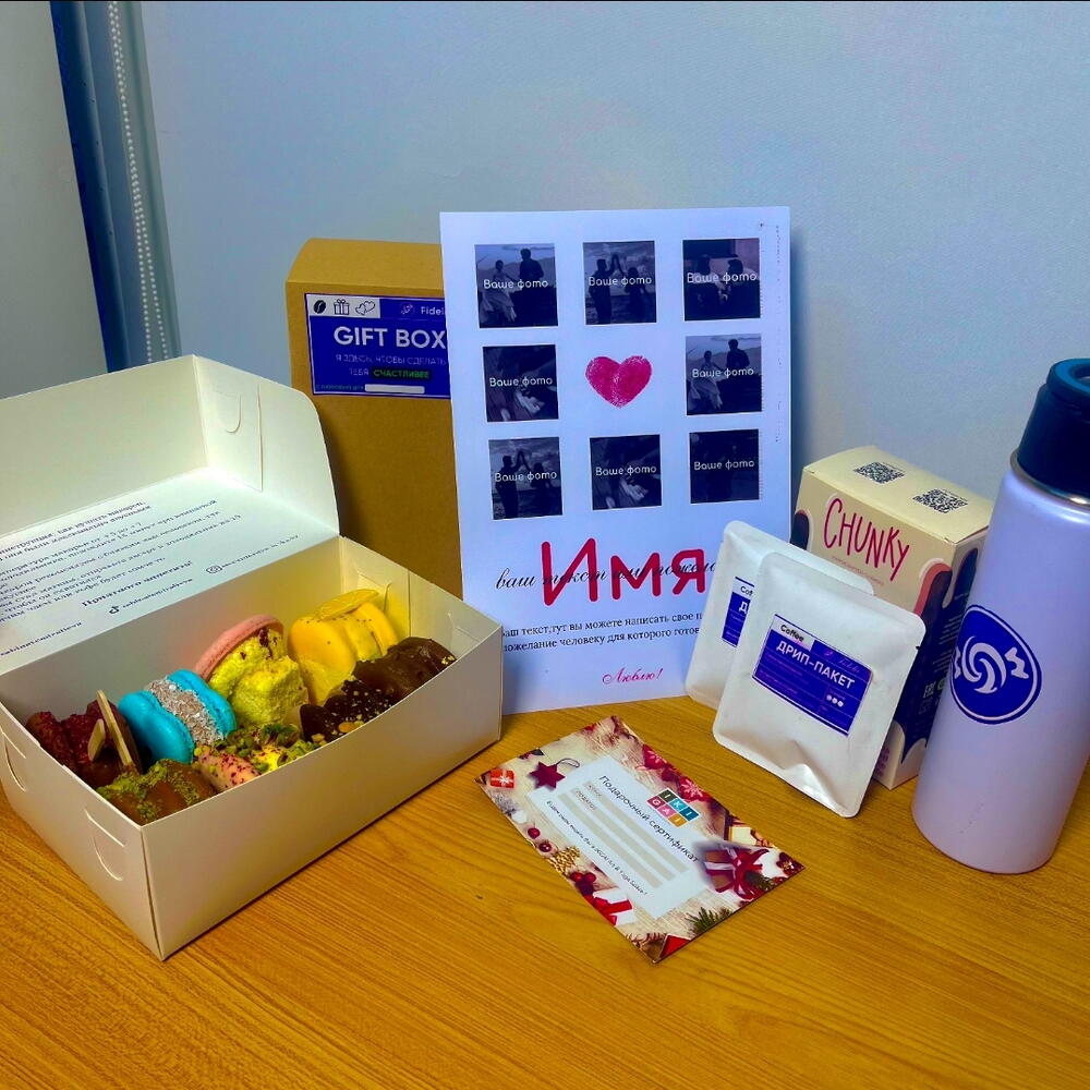 Погрузитесь в атмосферу заботы, тепла и приятных эмоций с набором, созданным для тех, кто любит удивлять. Это идеальный подарок для партнёра, друга или близкого человека — продуманный до деталей и наполненный маленькими праздниками внутри. --- ✨ Что внутри набора: ❤️ Романтический коллаж с вашими фото Персональная история любви, собранная в стильный постер. Трогательный жест, который заставит улыбнуться и сохранить лучшие моменты рядом. 🍬 Бокс авторских макаронс Ассорти ярких и нежных макаронс с разнообразными вкусами. Каждый десерт — маленькое удовольствие, созданное вручную. 🎁 Подарочный сертификат на йогу Отличная возможность подарить гармонию, расслабление и время для себя. Подойдёт для любого уровня подготовки. Сертификат-абонемент действует месяц, на посещения в студию на любую практику. ☕ 2 дрип-пакета свежего кофе Ароматный кофе, который можно заварить где угодно — дома, в офисе или в путешествии. Быстро, удобно и вкусно. 🍪 Мини-печенье Chunky Хрустящее лакомство в компактном формате — идеальный перекус и приятное дополнение к кофе. 🧊 Термос-штатив Уникальный аксессуар 2-в-1: стильный термос и удобный штатив для создания фото и видео. Практичный, современный и очень функциональный. --- 🎀 Особенность набора Каждый элемент подобран так, чтобы подарок стал не просто набором вещей, а целым впечатлением — вкусным, душевным и запоминающимся.