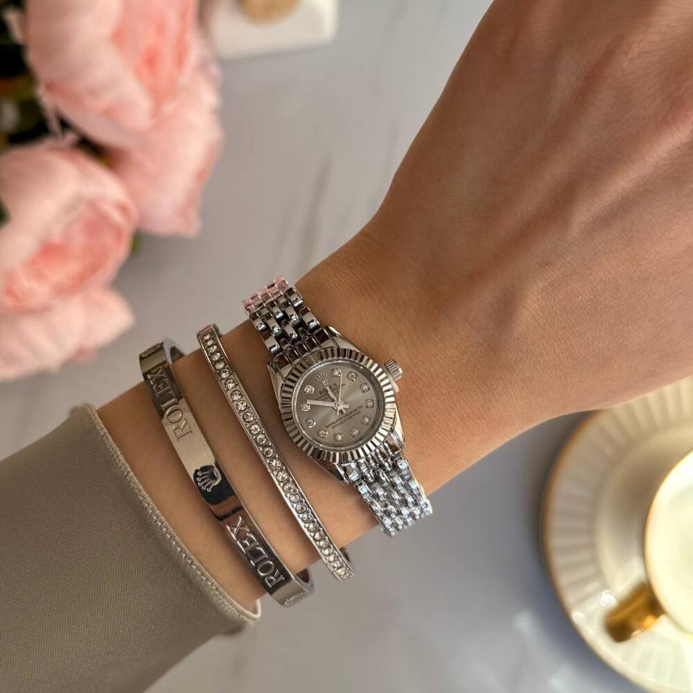 Описание товара: Элегантные часы с двумя стильными браслетами в комплекте. Часы выполнены в современном дизайне с прочным корпусом из нержавеющей стали. Механизм кварцевый, что гарантирует точность и надежность. Циферблат украшен изящными деталями, а ремешок из качественного материала обеспечивает комфортное ношение. Браслеты дополняют образ: один – из металлических звеньев, идеально сочетающийся с часами, второй – текстильный, для создания
