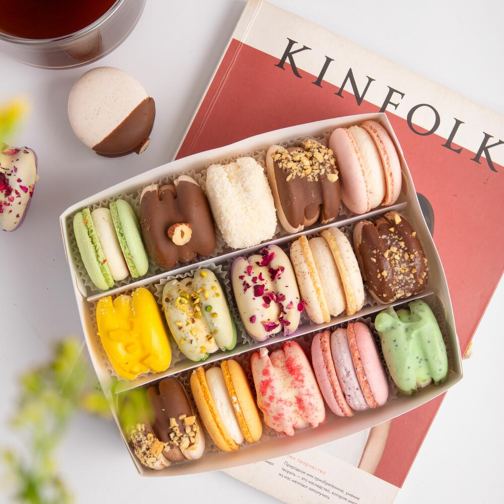 Макаронс- Минадальная мука, сливки натуральные, бельгийский шоколад, орехи и ягоды.