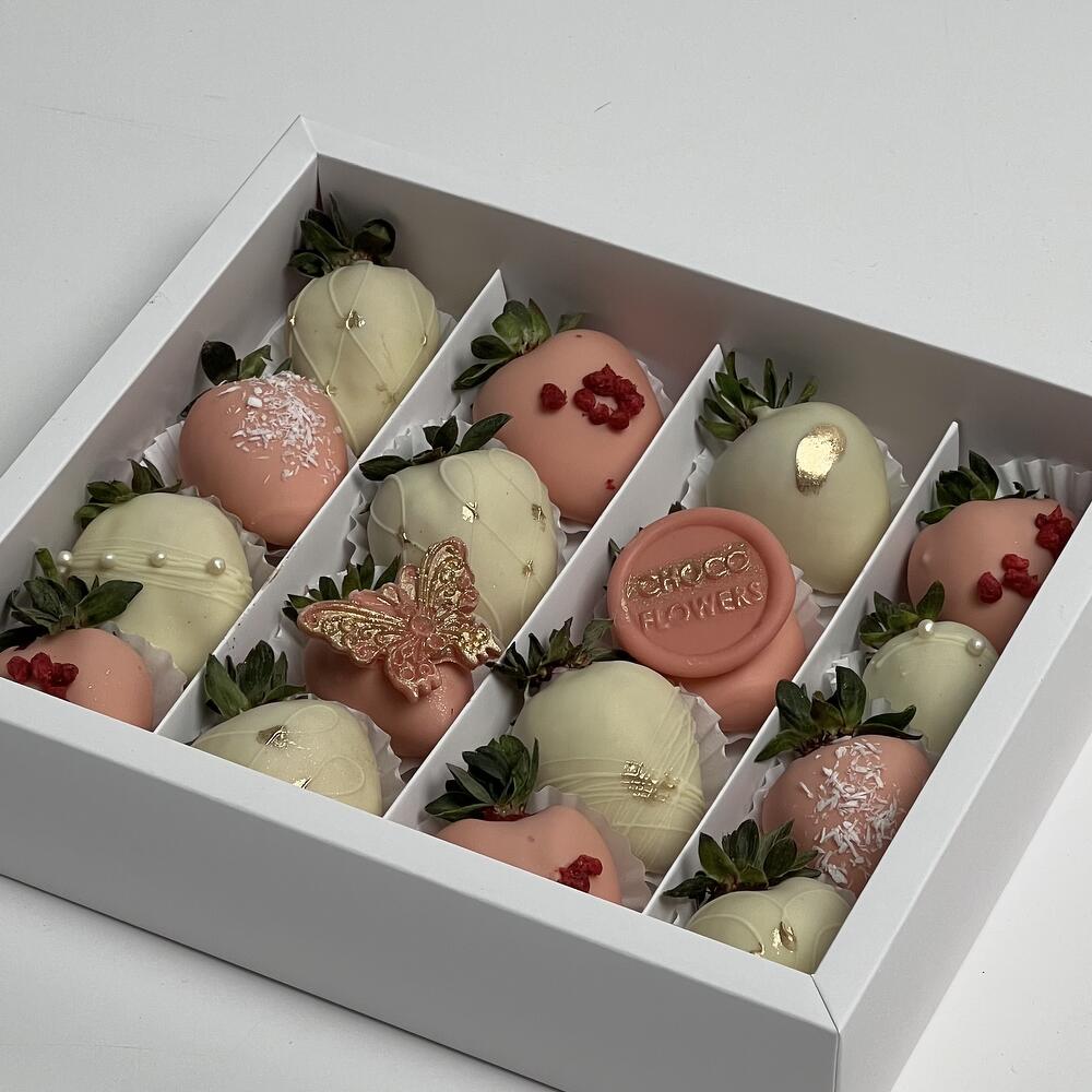 16 клубник в бельгийском розовом шоколаде; В дополнении используются посыпки: кандурин, кокосовая стружка, сублимированная малина; Шоколад ручной работы