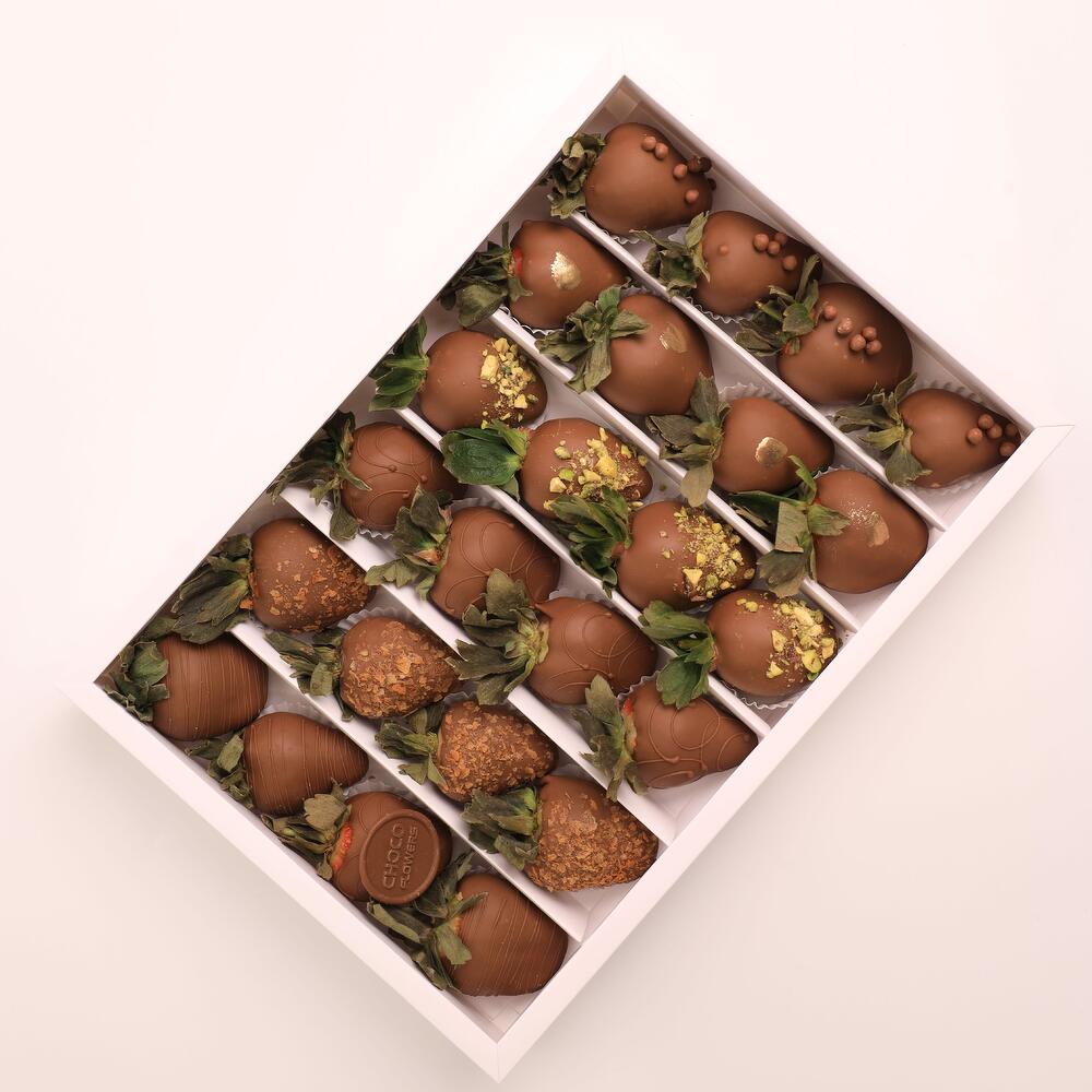 24 клубник в бельгийском молочном шоколаде; В дополнении используются посыпки: вафельная крошка, фисташка, кандурин и вафельные шарики; Шоколад ручной работы