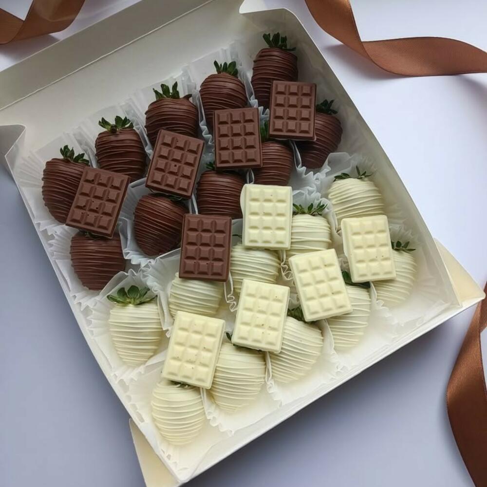 Состав шоколада: ✔️ Какао-масло ✔️ Тёртое какао ✔️ Сухое молоко (для молочного и белого шоколада) ✔️ Сахар ✔️ Лецитин подсолнечный (натуральный эмульгатор) ✔️ Ваниль натуральная Состав товара: Отборная свежая клубника 20 шт Молочный бельгийский шоколад (для покрытия и украшения): Тёртое какао Какао-масло Сухое молоко Сахар Лецитин подсолнечный Натуральная ваниль Белый бельгийский шоколад (для покрытия и украшения): Какао-масло Сухое молоко Сахар Лецитин подсолнечный Натуральная ваниль Мини-плитки шоколада (молочный и белый) Шоколадные узоры (из белого и молочного шоколада)