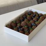 • Клубника в молочном шоколаде — 24 шт. • голубика — 12-15 шт. • Посыпка: отсутствует (поверхность клубники украшена полосками молочного шоколада). Название и состав шоколада: Молочный шоколад (состав: сахар, какао-масло, какао тертое, сухое молоко, эмульгатор — соевый лецитин, натуральный ванилин).