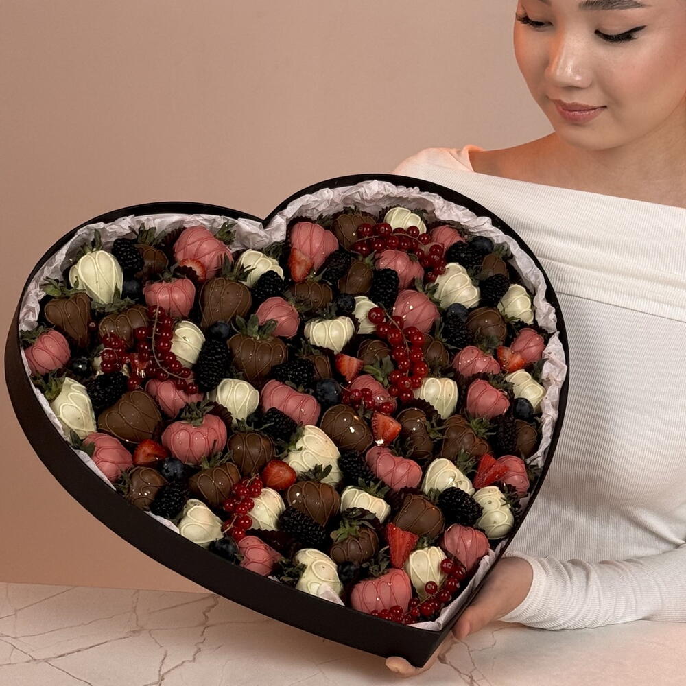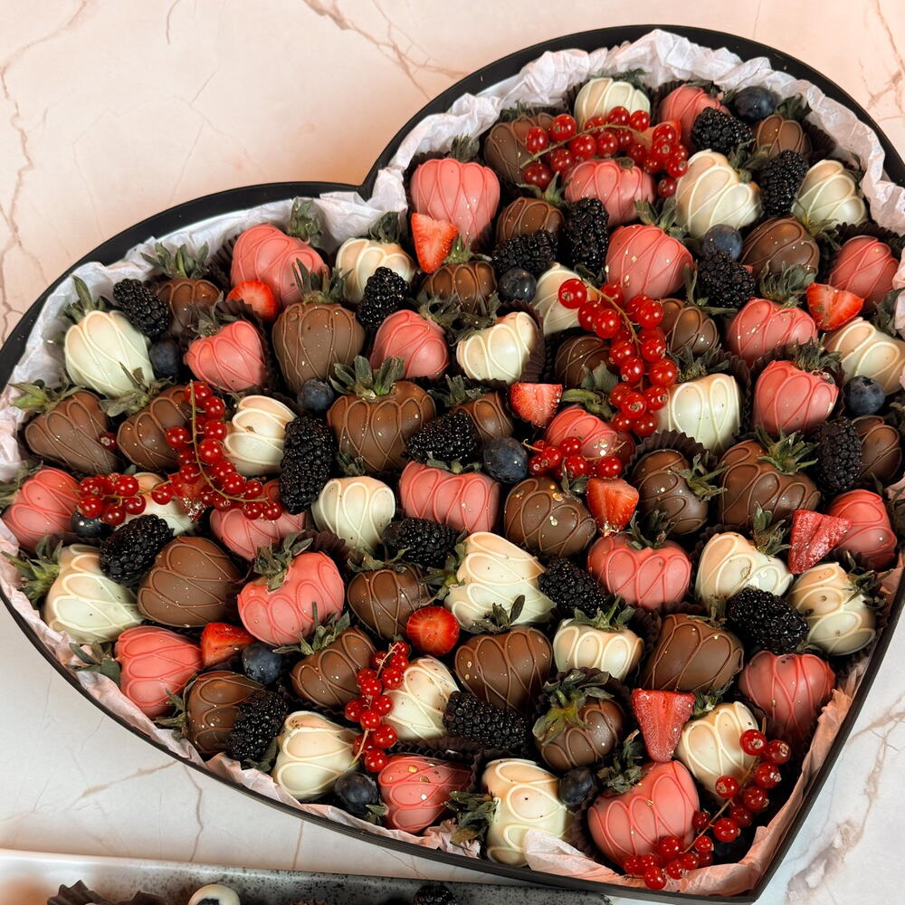 Клубника в бельгийском шоколаде (молочный, белый), свежая клубника, ежевика, голубика, красная смородина. Состав молочного шоколада Callebaut: Сахар, масло какао, сухое молоко, какао масса, эмульгатор — соевый лецитин, натуральный ванильный ароматизатор Состав белого шоколада Callebaut: Сахар, масло какао, сухое молоко, эмульгатор — соевый лецитин, натуральный ванильный ароматизатор