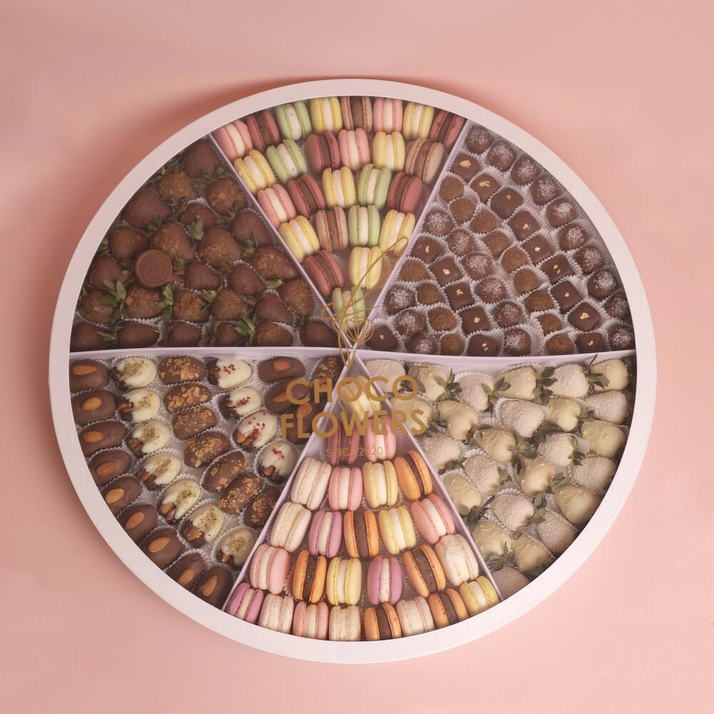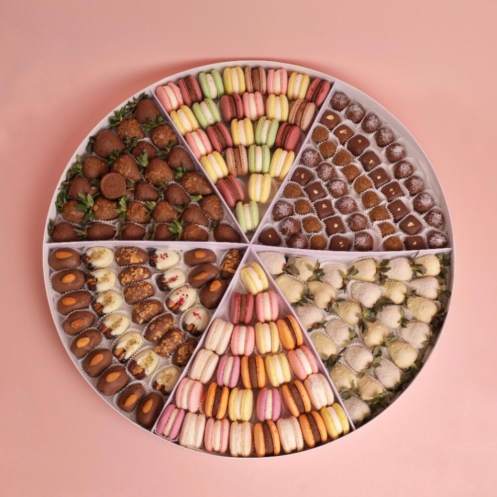 Состав : Макаронсы микс вкусов 52 Клубника 25 в молочном шоколаде 25 шт в белом шоколаде Трюфель 35 Финики в шоколаде (Посыпка миндаль) в белом и молочном шоколаде