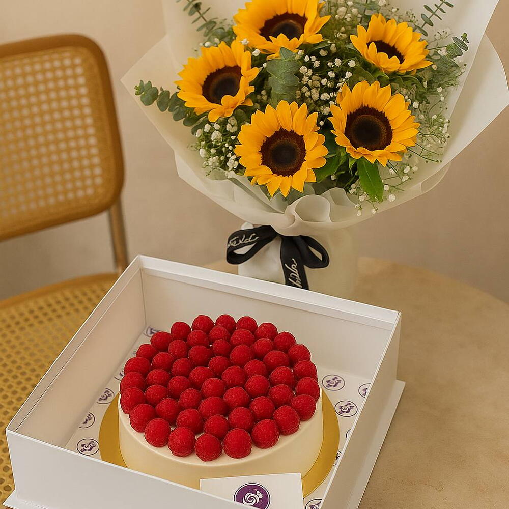 Изящный бенто-торт с воздушным кремом и спелой малиной сверху дарит лёгкость и свежесть в каждом кусочке. Его дополняет аккуратный букет свежих цветов, который делает подарок не только вкусным, но и по-настоящему праздничным и запоминающимся.