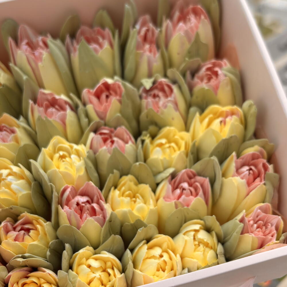 25 зефирных тюльпанов в коробке Состав: яичный белок, Сахар, агар-агар, фруктовое пюре, лимонная кислота, краситель пищевой