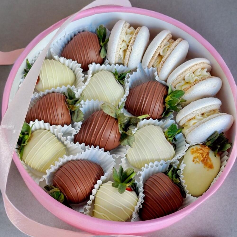 Идеальный дуэт ароматной свежей клубники в нежном молочном и белом шоколаде и нежнейших французских пирожных! Отличный подарок для любителей изысканных и необычных сладостей! Каждый набор мы изготавливаем специально для вашего заказа, поэтому вы можете быть уверены в ее свежести. Возможно изготовление клубники в молочном, темном и белом шоколаде с разными видами посыпок и декора (мы можем обсудить детали и ваши пожелания при оформлении заказа).