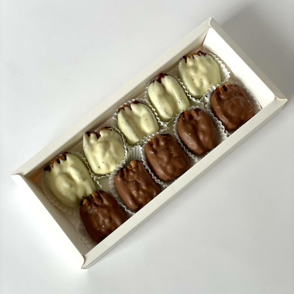Изысканный набор из 10 штук королевских фиников в белом и молочном шоколаде Callebaut. Внутри финика жареные орехи кешью, грецкий и миндаль. Срок годности 21 день, при условии хранения в холодильнике. Перед употреблением рекомендуем заранее достать десерт из холодильника, и дать ему согреться в течение 15-20 минут при комнатной температуре, так шоколад станет нежнее и приятнее.
