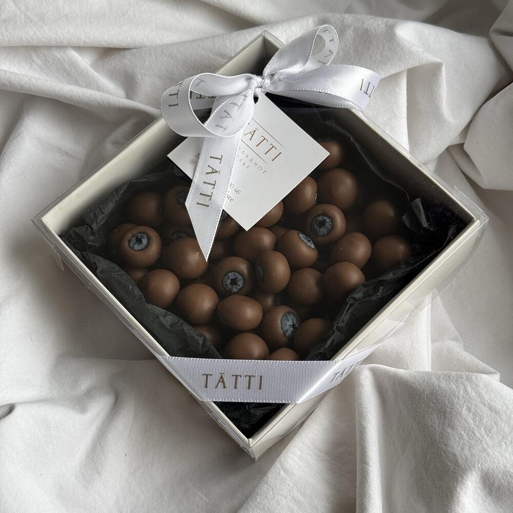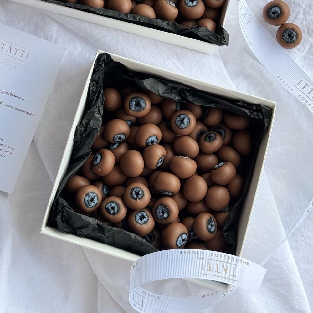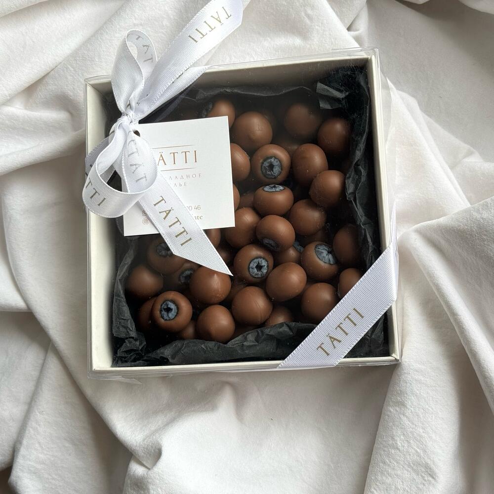 Таңдалған жаңа көкжидек қышқыл-тәтті дәмімен бельгиялық Callebaut сүтті шоколадында. Жұмсақ шоколад жидектердің табиғи қышқылдылығын мінсіз толықтырады. Эстетика мен сапа бұл өнімді сыйлыққа және жеке ләззат үшін мінсіз етеді.