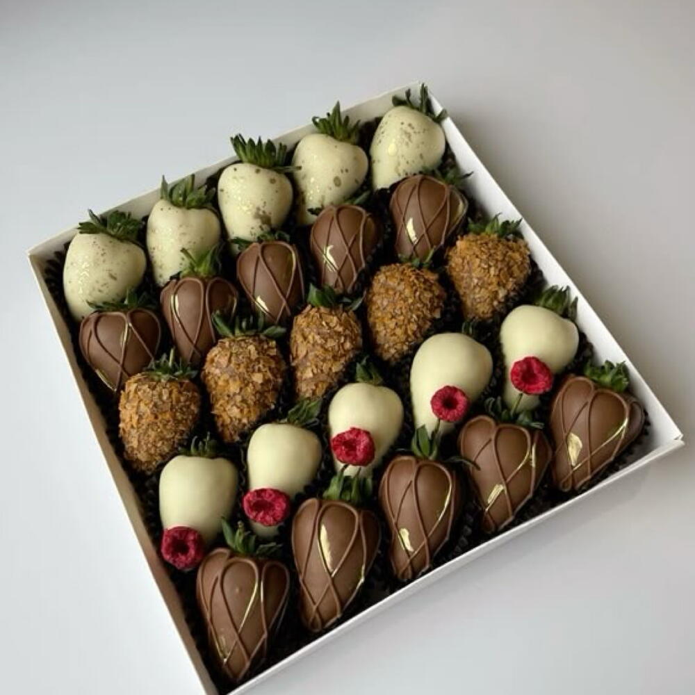 Свежая клубника Натуральный бельгийский шоколад “Callebaut” Состав: какао-масло, тертое какао, сухое молоко, глецилин натуральный, ваниль Вафельные крошки Сублимированная малина