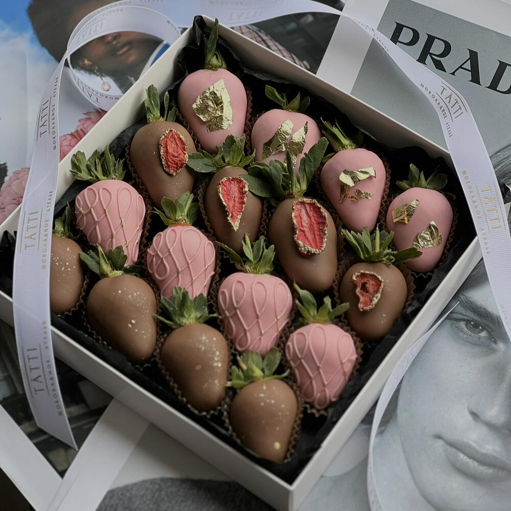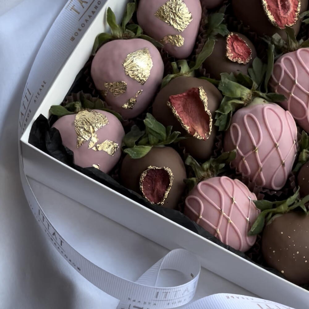 AMORE қорапшасы — нағыз бельгиялық шоколадта оралған шырынды таңдап алынған құлпынай Callebaut. Ішінде — екі дәм: нәзік қызғылт құлпынай және классикалық сүтті. Үстінде — хрустты сублимирленген құлпынай және нәзік кондитерлік алтын. Бірінші тілімімен-ақ ғашық ететін мінсіз тәтті комплимент. 🍓✨