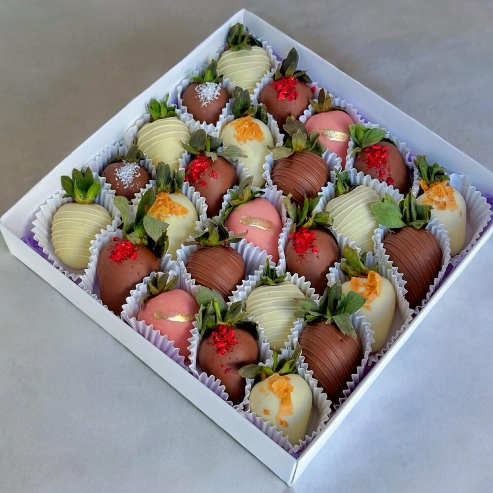 Сочетание изысканного молочного шоколада, ароматной спелой клубники и яркого вкуса сублимированной малины вдохновило нас на создание потрясающего набора “Charm”. Каждый набор мы оформляем брендированной лентой, кладем информационную карточку и отправляем в подарочном пакете. По вашему желанию мы подпишем открытку от вашего имени (надпись к открытке укажите в комментариях к заказу).