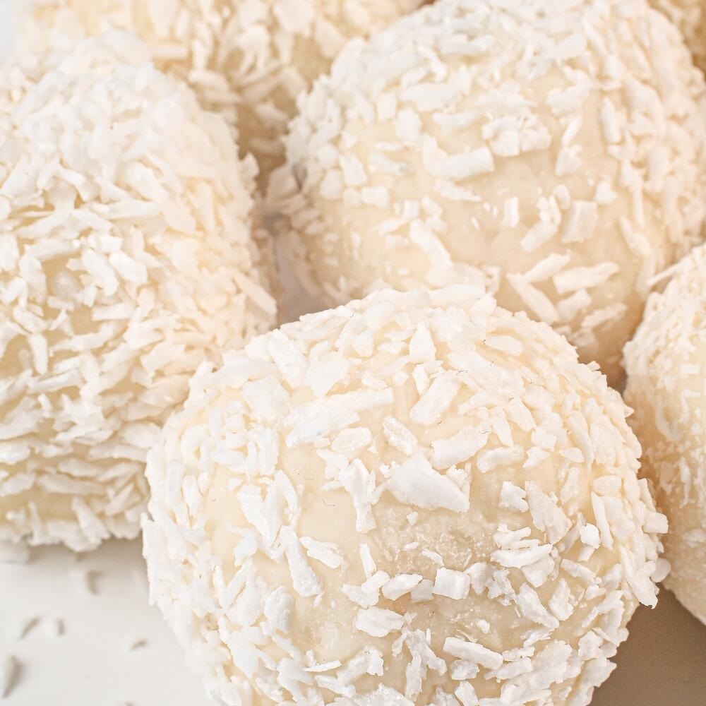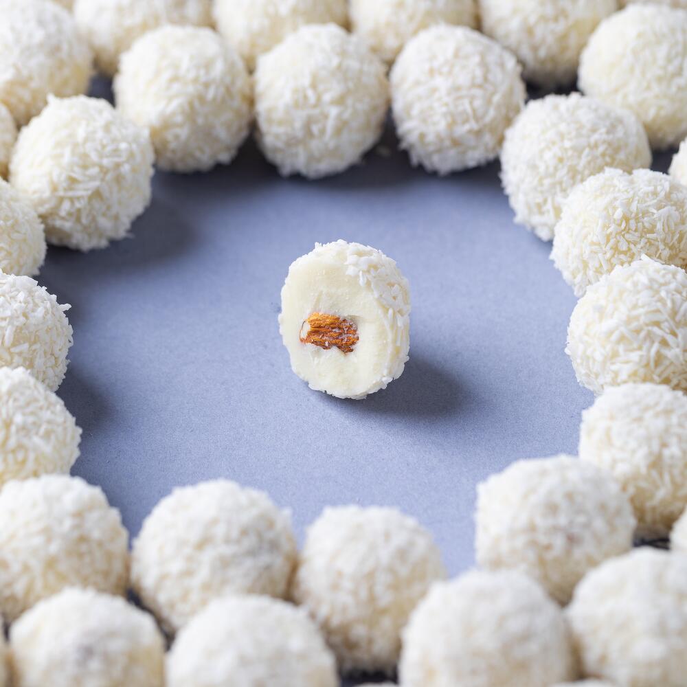 Кокосовая паста, кокосовые сливки, сироп топинамбура, кокосовая стружка, сухие сливки, белый шоколад, миндаль.