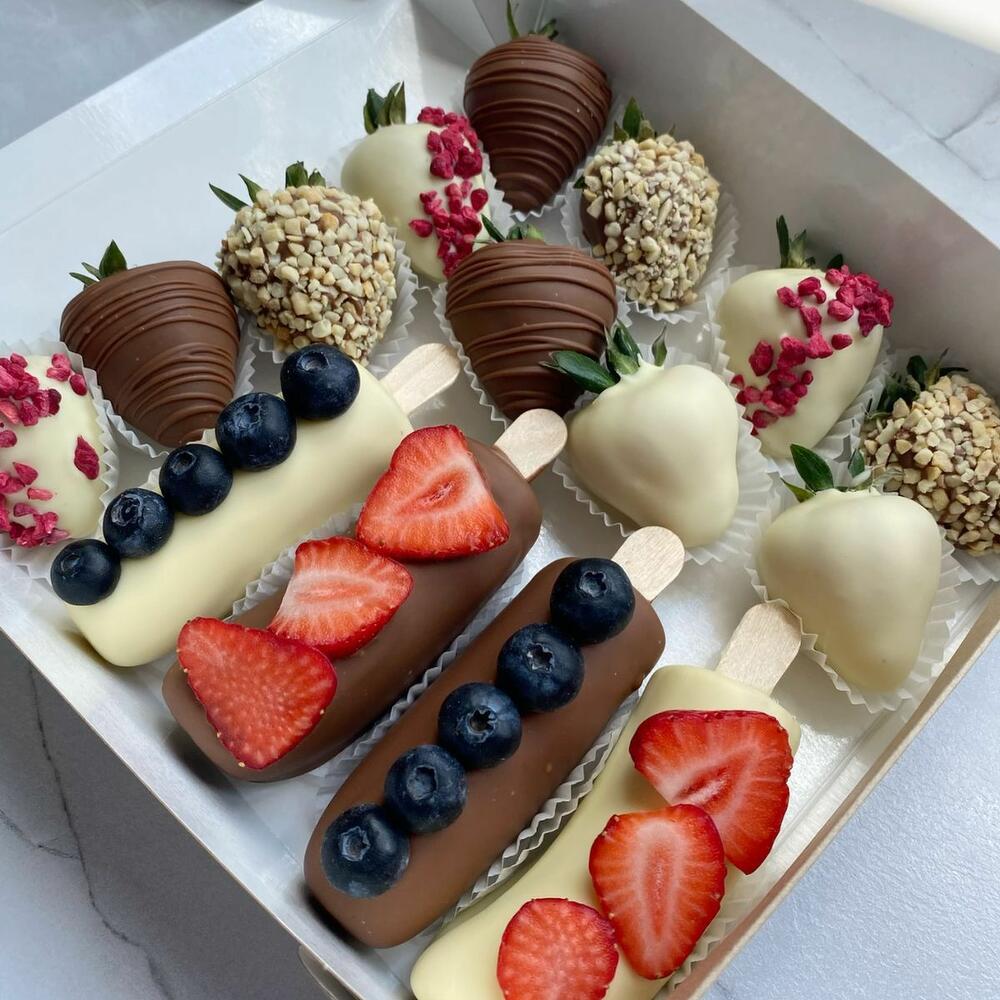 Изящный подарочный набор с клубникой в белом и молочном шоколаде, украшенной сублимированной малиной и дроблёным фундуком. В комплекте эскимо-кейки из бисквита в шоколадной глазури, с ягодами клубники и черникой.