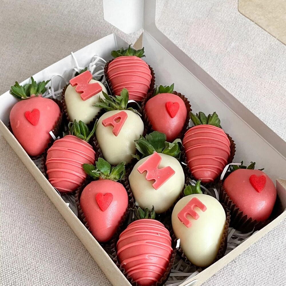 12 штук клубники белом и розовом шоколаде Клубника свежая в шоколаде 12шт с надписью Маме