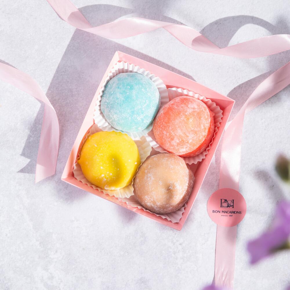 Рисовая мука, молоко, кукурузный крахмал, творожный сыр, сливки, клубника, карамель, банан, манго-персик джем, орео начинка в зависимости от вкуса моти.
