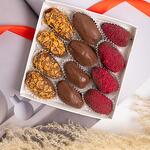 Бельгийском шоколаде. Состав: какао-масло, тертое какао, сухое цельное молоко, сахар, натуральный лецитин и ванилин. Клубника, сублимированная малина и вафельная крошка.