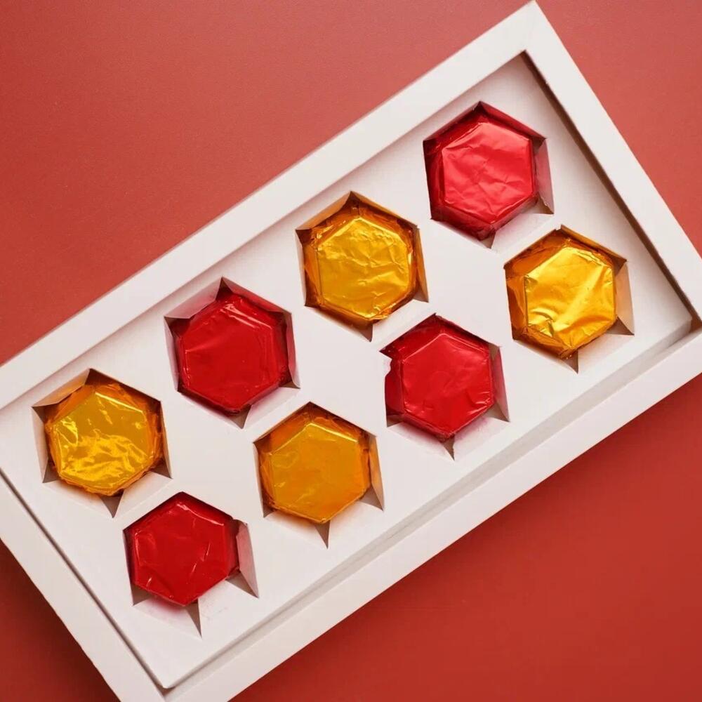 Набор из 8 конфет в шоколаде ручной работы с начинками из жента со вкусом финика без сахара и арахиса.
