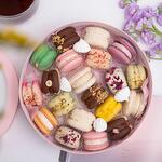 Макаронс- Миндальная мука, сливки натуральные, бельгийский шоколад, орехи и ягоды.