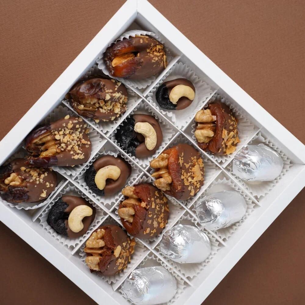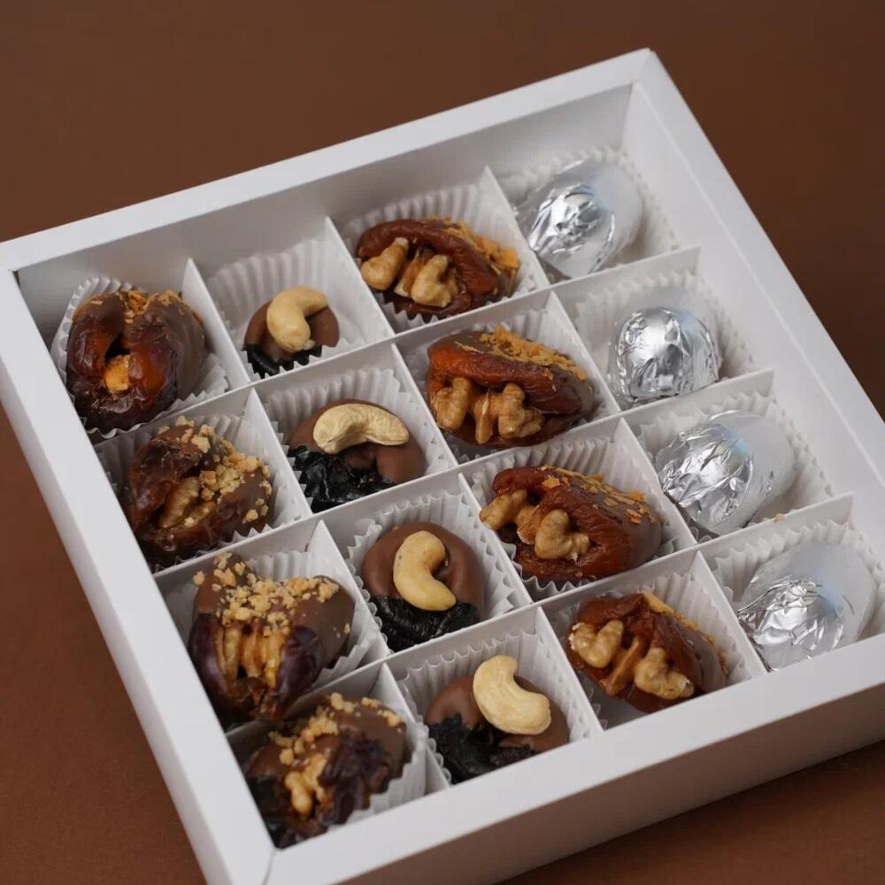 Финики, чернослив, курага с орехами в молочном бельгийском шоколаде - 12 шт Жент в шоколаде с изюмом - 4 шт.