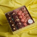 В наборе 20 шт макаронс, состав макаронс - миндальная мука, сливки натуральные, бельгийский шоколад, арахис, миндаль, малина, фисташка.
