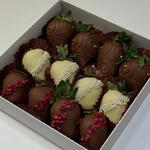 Жаңа құлпынай, іріктелген, шоколадпен қапталған 12 дана Бельгиялық шоколад Callebaut Шоколадтың құрамына: какао майы какао массасы қант құрғақ тұтас сүт (сүтті және ақ шоколадқа арналған) эмульгатор: соя лецитині табиғи ваниль Набордағы шоколад түрлері: сүтті шоколад Мөлдір қақпағы және атлас таспасы бар сыйлық қорабы. Безендіру: қант шариктері, лиофилизденген таңқурай.