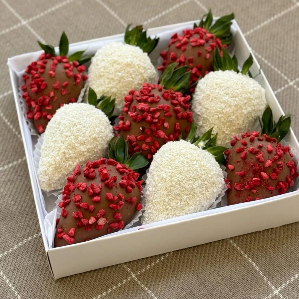 Клубника в бельгийском молочном и белом шоколаде Callebaut 9шт Декорированным сублимированной малиной и кокосовой стружкой