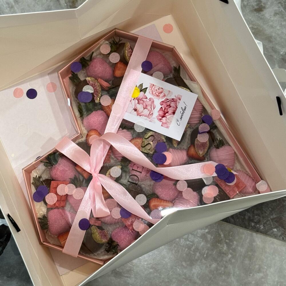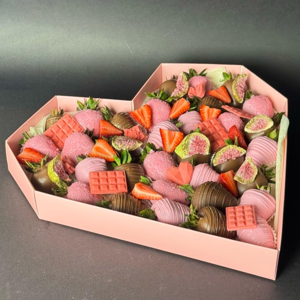 35 шт клубники в бельгийском шоколаде В большом сердце, украшенных инжиром и плитками шоколада