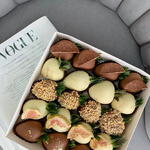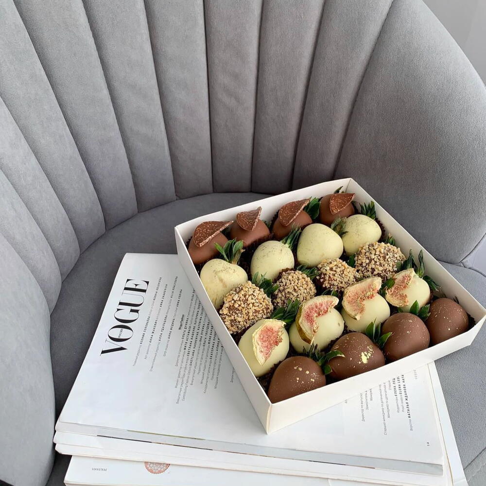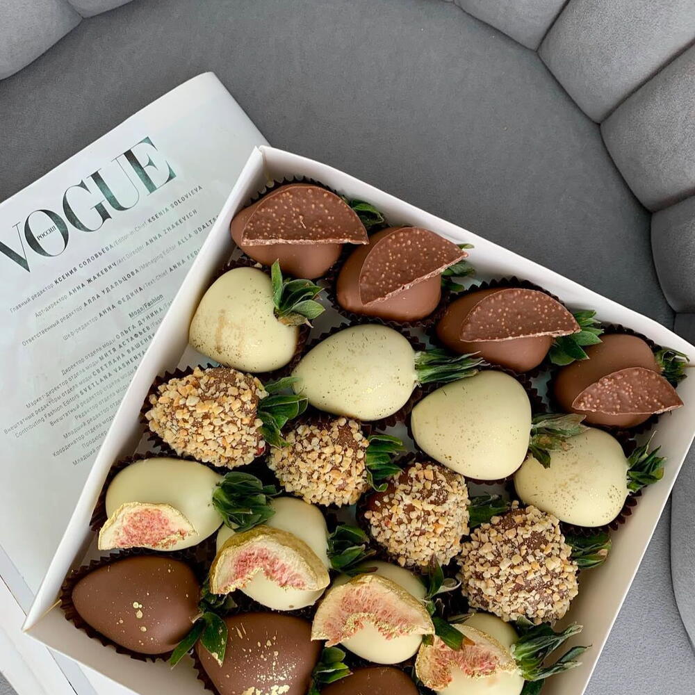 Набор из 20 клубник в шоколаде с инжиром и орешками — премиальный сладкий букет Погрузитесь в атмосферу роскоши и изысканного вкуса с нашим набором из 16 отборных клубник, украшенных свежим инжиром, орехами и фирменным шоколадным декором. Каждая ягода — это ручная работа и идеальное сочетание текстур: 🍓 Сочная клубника в бельгийском халал-шоколаде — гладкая, нежная, с ярким вкусом. 🌿 Свежий инжир — добавляет натуральную сладость и эстетичную подачу. 🥜 Отборные орешки — фундук, миндаль или грецкий (по оформлению), дающие тонкий хруст. 🍫 Шоколадный декор — создаёт премиальный вид и завершает композицию. Набор оформлен в стильной подарочной коробке — идеально подходит для особых событий, свиданий, поздравлений, а также как незабываемый подарок, который впечатлит визуально и по вкусу. 🎁 Подходит для: — Подарков любимым — Дней рождения — Праздничных сетов — VIP-заказов — Фотосессий и сервировки стола Этот набор — про вкус, эстетику и эмоции. Подарите момент, который будут помнить!