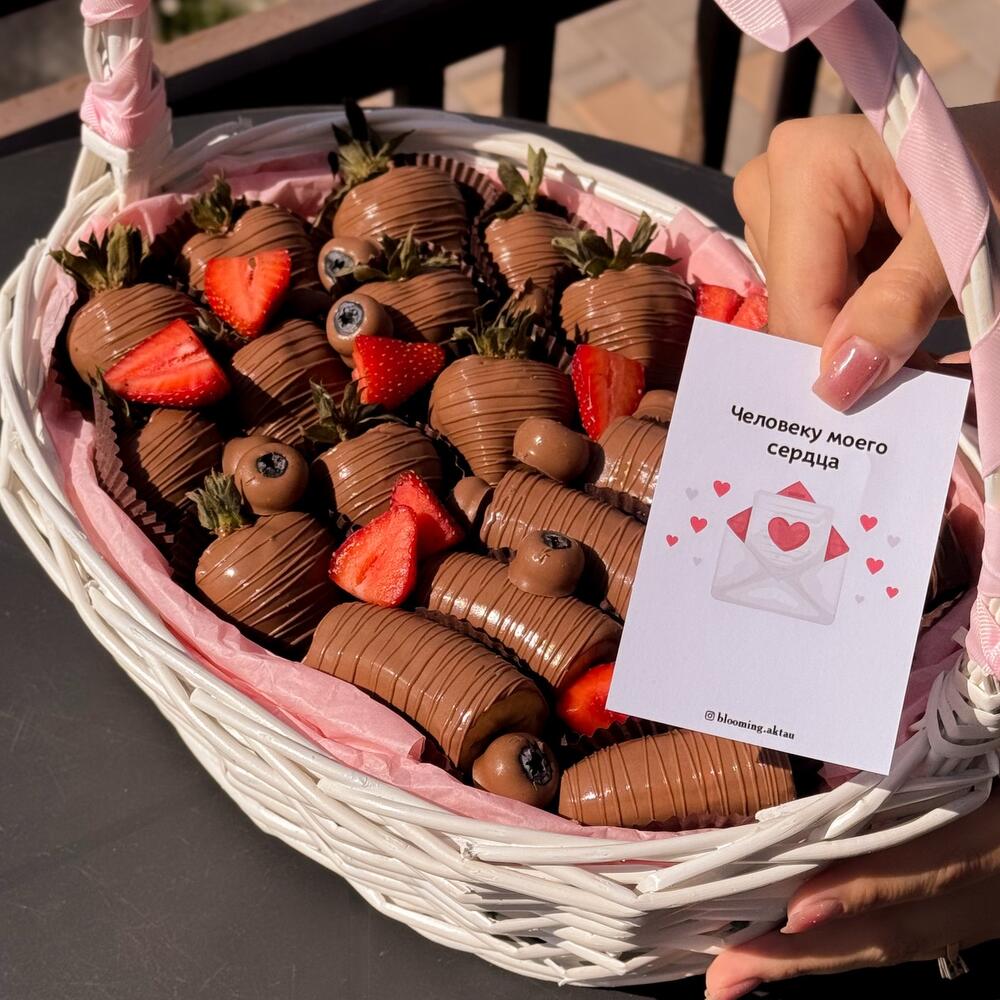 Эффектная большая корзина со свежей клубникой и бананы и голубики в бельгийском молочном шоколаде. Декорирована свежими ягодами клубники и голубики. Идеально для больших сюрпризов, романтических встреч или корпоративного подарка.