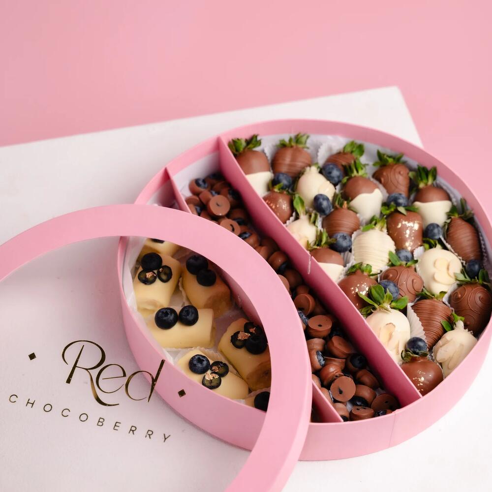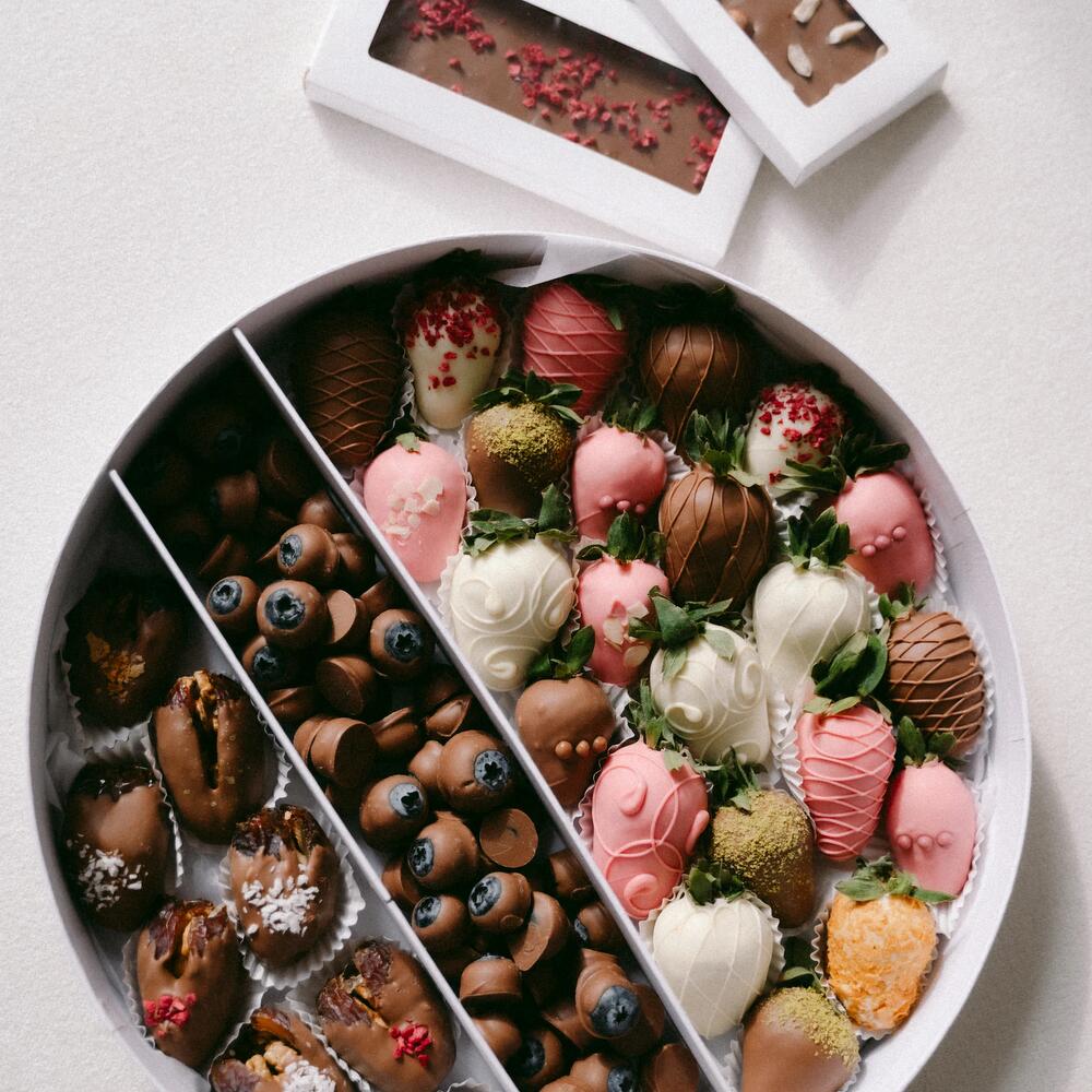 В сладкий микс входит 25шт клубник, 250гр голубики, 6 бананов / 6 фиников в шоколаде (на выбор)