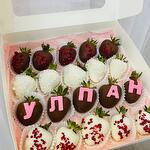Количество:В коробке 16 клубник в шоколаде. Посыпка:— Сублимированная малина (красная посыпка)— Кокосовая стружка (белая посыпка)— Фигурные буквы из сахарной мастики (розовые буквы УЛПАН) Название и состав шоколада:— Белый шоколад: сахар, сухое молоко, какао-масло, эмульгаторы (лецитин), натуральная ваниль— Молочный шоколад: сахар, какао-масло, молочный порошок, какао тертое, эмульгаторы (лецитин), ванилин— Украшено: сублимированная малина, кокосовая стружка, сахарная мастика для букв