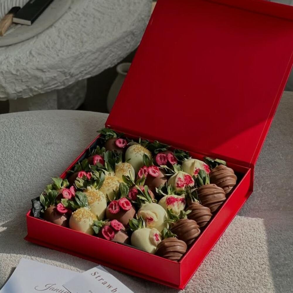 Клубника в молочном шоколаде Callebaut 15 шт. Клубника в белом шоколаде 10 шт., сахарная посыпка, сублимированные кусочки малины 3-4 мм, сублимированная клюква. Состав шоколада: какао-бобы, какао-масло, сахар, молоко, лецитин, ароматизаторы.