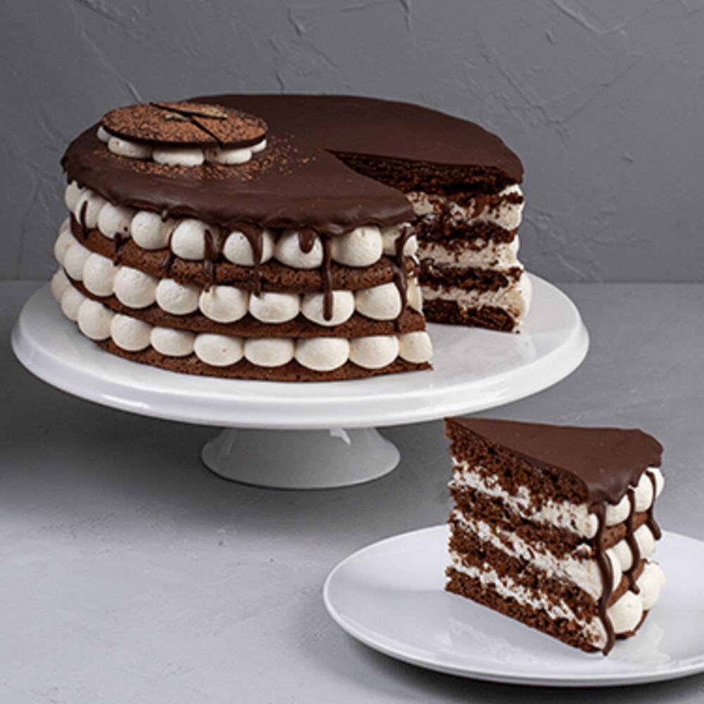 Состав: сливки, сливочный сыр, творожный сыр, сахарная пудра, мука пшеничная, яйца, сахар, сливочное масло, шоколад, какао-порошок, разрыхлитель теста, молоко. Условия хранения: хранить при температуре не выше +6°С. Срок годности: с даты изготовления не более 36 часов. Пищевая ценность в 100 г продукта: белки –7 г, жиры – 26 г, углеводы – 43 г. Энергетическая ценность 1798 кДЖ/430 кКал. Дата и время изготовления указаны на упаковке. Стандартный - 1кг