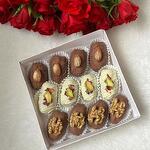 Королевские финики в бельгийском шоколаде Описание: Побалуйте себя и своих близких изысканным угощением – королевскими финиками в бельгийском халяльном шоколаде. Каждая конфета создана из натуральных фиников, покрытых нежным молочным и белым шоколадом и украшенных грецкими орехами, миндалем и фисташками. Сочетание сладости фиников, насыщенного шоколада и ореховой хрустящей нотки делает этот десерт идеальным для ценителей утонченного вкуса. Особенности: Полностью натуральный состав Без добавления сахара (сладость за счет натуральных фиников) Роскошный вид благодаря золотому декору Идеально для подарка или стильного десерта к чаю и кофе