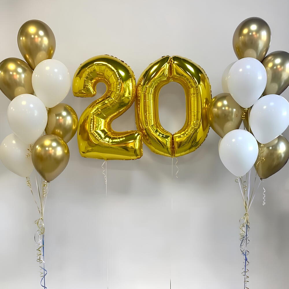 Праздничная композиция с фольгированными цифрами 2 и 0 в роскошном золотом цвете и двумя фонтанами по 8 шаров каждый. Шары в белом и золотом хроме создают стильное сочетание и атмосферу торжества. Отлично подойдёт для дня рождения, юбилея или корпоративного праздника. Эффектное украшение, которое подчеркнёт важность вашего события! ✨