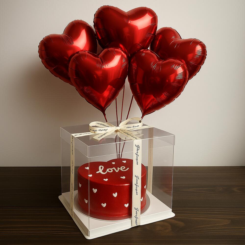 Нежный торт в форме сердца с воздушными коржами и лёгким кремом, украшенный маленькими сердечками. В комплекте 5 стильных фольгированных шаров в форме сердца и прозрачная подарочная коробка с лентой. Готовое решение для романтического подарка, которое говорит о чувствах без слов.