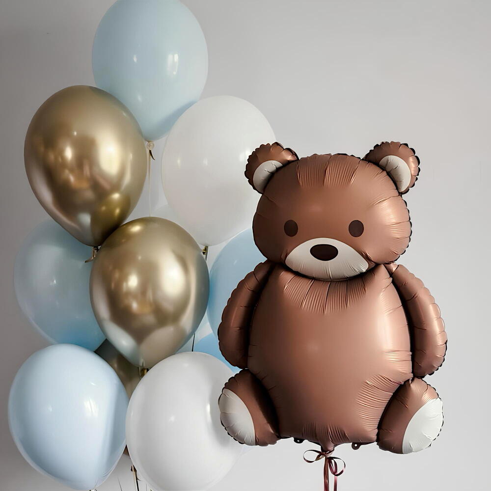 Очаровательная композиция с большим фольгированным мишкой и фонтана из 13 воздушных шаров. Шары в нежных оттенках голубого, белого и золотого идеально сочетаются с милым медвежонком, создавая уютную и праздничную атмосферу. Отличный выбор для детского дня рождения, выписки из роддома или первого праздника малыша! 🧸💙