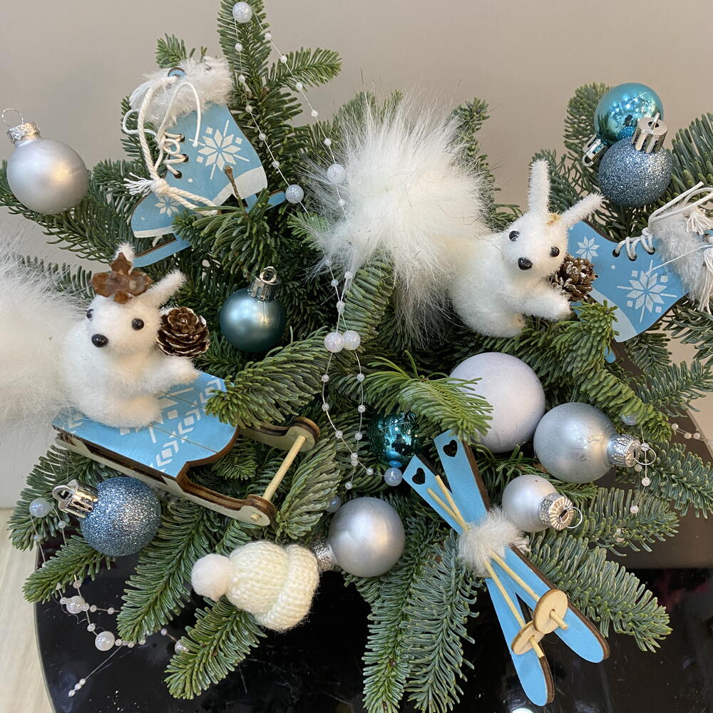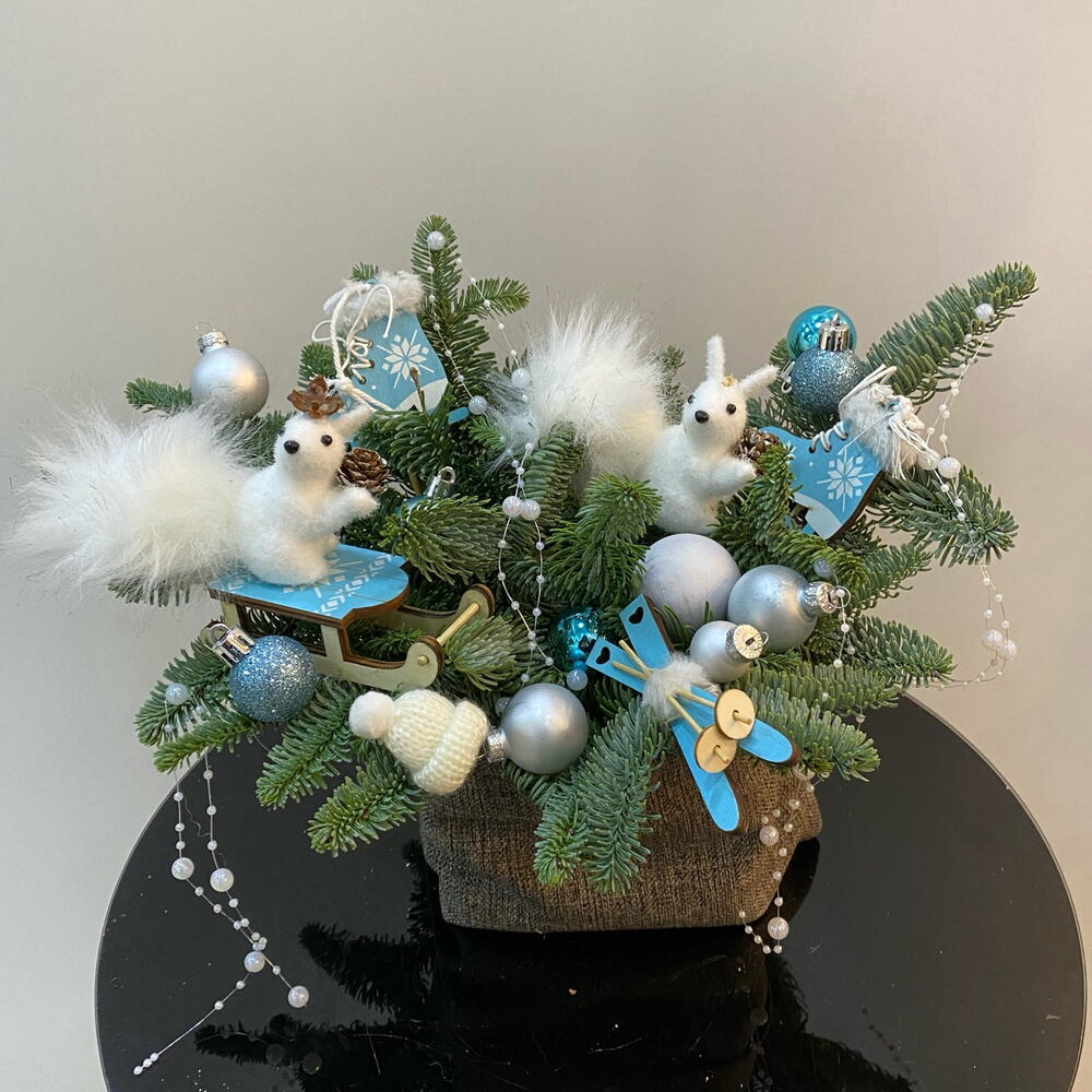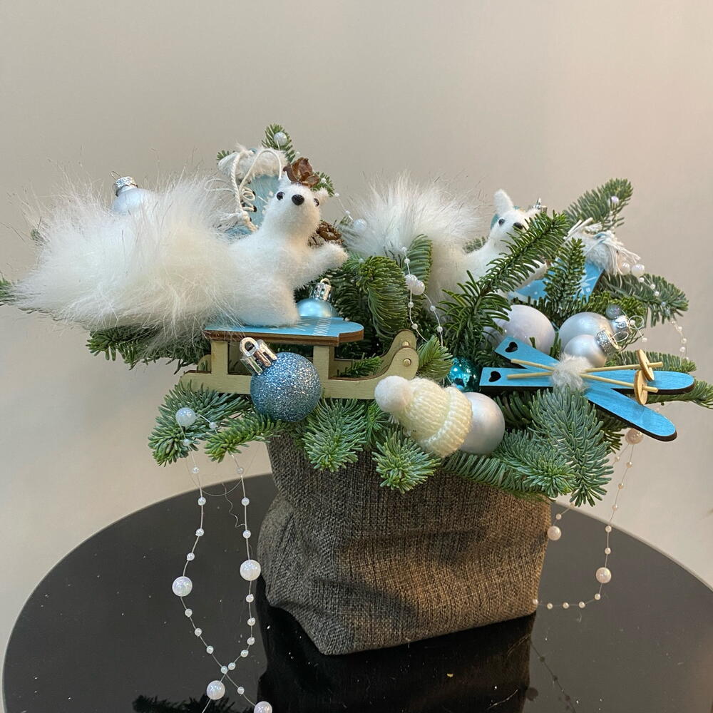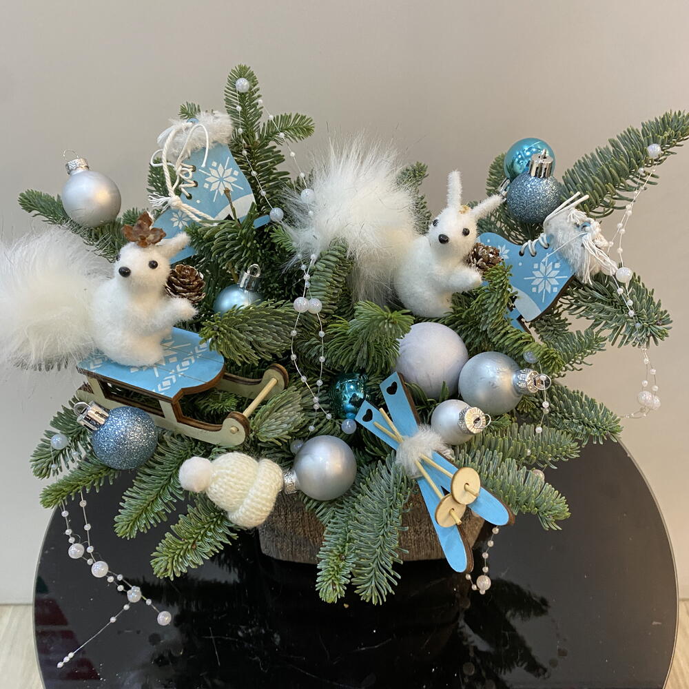 Новогодняя композиция с нобилисом на оазисе. Белочки на санках, коньки, лыжи и игрушки.