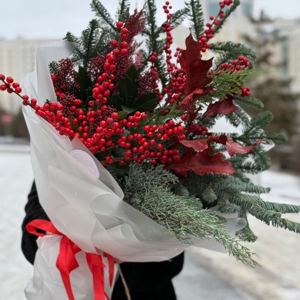 Илекс - 2 дана Скиммия - 1 дана Дизайнерлік қаптама - 8 дана туя крашенная - 1 дана листья бука стабилизированные - 1 дана нобилис l - 1 дана туя зеленая - 1 дана нобилис м - 1 дана кипарис м - 1 дана