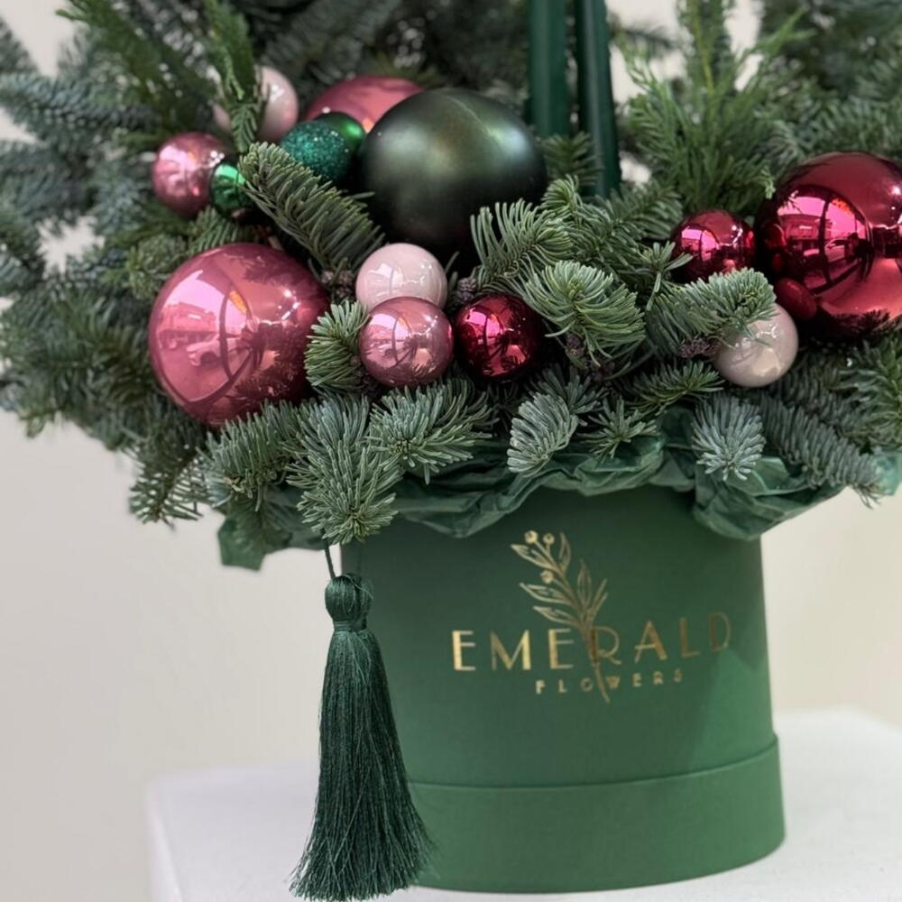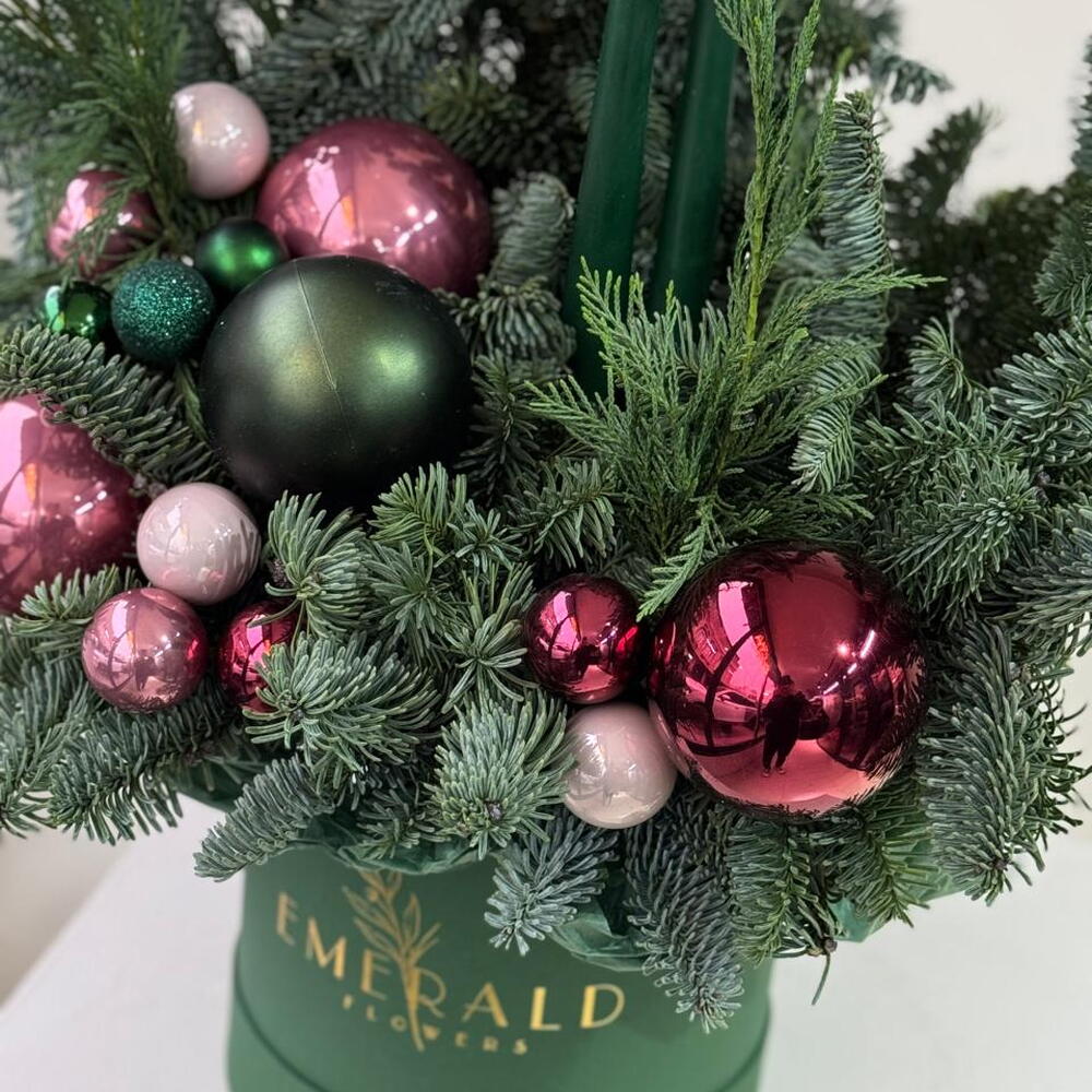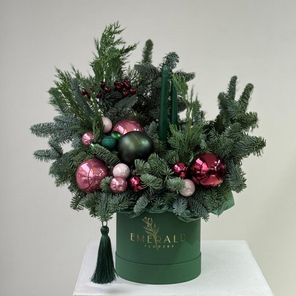 Ягоды декоративные - 1 дана Нобилис - 2 дана Елочные игрушки - 15 дана Коробка брендированная - 1 дана туя пучок - 1 дана кисть декоративная подвеска - 1 дана свечи немецкие - 2 дана