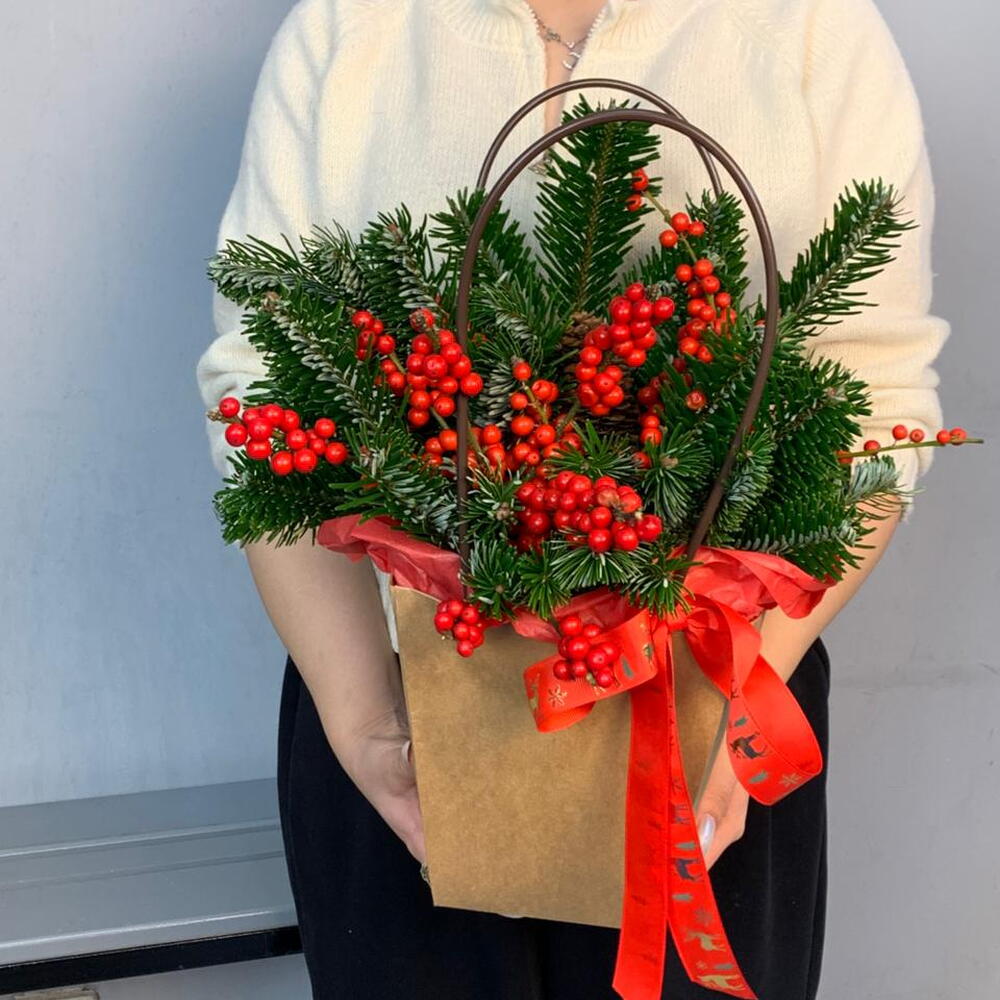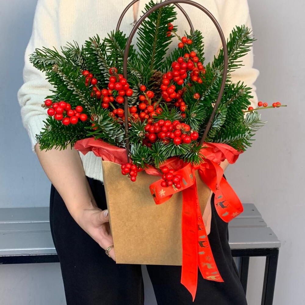 🎁 Композиция 184 — “Яркая Зимняя Искра” Эта новогодняя композиция создана, чтобы дарить атмосферу праздника и тепла. Нобилис 🌲 наполняет ароматом зимнего леса, илекс 🔴 добавляет ярких акцентов и праздничного настроения. Красная тишью ❤️ и репсовая лента 🎀 подчёркивают стиль и насыщенность композиции. Удобно оформлено в крафтовую сумочку 👜, что делает подарок аккуратным, современным и готовым к вручению. Композиция 184 — маленькая, но очень праздничная искра, которая поднимает настроение с первого взгляда ✨